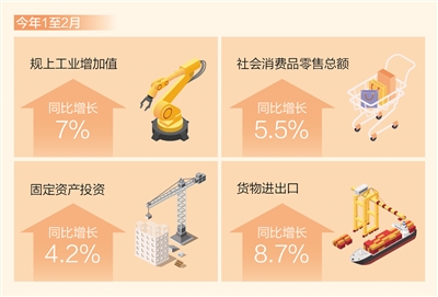 主要生产需求指标稳中有升。从生产看,工业生产有所加快,消费品制造业和高技术制造业回升,行业和产业增长面扩大。1至2月,规模以上工业增加值同比增长7%,比上年12月加快0.2个百分点。从增长面看,超过九成的行业、超过六成的产品同比实现了增长。服务业增势向好、景气度回升,1至2月,服务业生产指数同比增长5.8%。从需求看,市场销售继续恢复,升级类商品消费潜力释放,节假日推动服务消费升温,1至2月,社会消费品零售总额同比增长5.5%。投资增速回升,制造业投资较快增长,大项目带动作用比较明显,1至2月,固定资产投资同比增长4.2%,比上年全年加快1.2个百分点,其中制造业投资增长9.4%,加快2.9个百分点。进出口保持较快增长,1至2月,货物进出口同比增长8.7%。